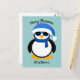 Cute illustration of black and white penguin with blue Santa hat, sun glasses and scarf.