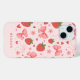 A cute, pink coquette themed iPhone case, designed with strawberries, bows, hearts, and flowers. Personalise with your name or initials at the bottom of the case.