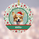 This cute ornament feature charming artwork of a corgi, which has a watercolor look. It's set against a sparkly sage green and sparkle lights background, and then bordered in a darker green with a red and green ornament pattern. Your or your recipient's dog's name appears in white on a green and red banner underneath the picture. Make sure to type the name you want in the Personalise section.