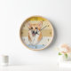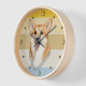 A portrait of an adorable brown and white Corgi Dog is the feature on this clock. The image is placed on a retro, slightly distressed striped sunset background. Dark gold numbers and diamond shaped markers around the perimeter make the clock easy to read. Perfect for anyone who has lost their heart to a loveable Corgi.