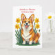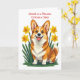A happy corgi sits among bright daffodils, ears perked and tongue out, radiating joy. With bold colours and clean lines, this playful design celebrates Wales and St. David’s Day, capturing springtime cheer with a loveable national mascot.