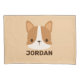 This design features cute little corgi dog with personalised name in brown modern sans serif font style on light brown background.