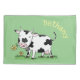 Our cute black and white friesian milking cow is in a meadow of green grass eating yellow daisies. Lots of bovine fun!