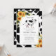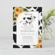 Cow Print Baby Shower Invitations with a cow pattern background, a cut cow, and sunflowers. Cute graphic of a calf wearing a sunflower on her ear.
