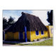 Cozumel architecture that looks like folk art with vivid yellow and blue in an off-the-beaten track location in the Yucatan Peninsula of Mexico. Some family put a lot of effort into making this thatched roof home as charming as possible. The door and window frames, as well as one post on the far left side of the front wall, are covered with folk art designs in vivid, primary colours.