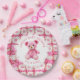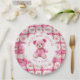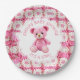 Pink and white crocheted teddy bear girl's baby shower personalized paper plates. An adorable pink teddy bear crocheted with pink and white yarn adds the sweetest touch.