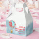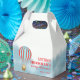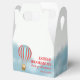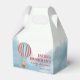 Favor box for baby shower features a cute cub in a hot air balloon flying over the clouds.
