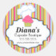 © 2012 Socialite Designs. Whimsical cupcake design stickers that incorporates a pink-icing cupcake, a baker's hat and colourful striped background.
