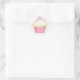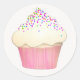 Cute illustration of white vanilla icing cupcake with rainbow sprinkles and pink wrapper. Original illustration by Maura Reed.
