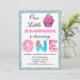 Bright and colourful light blue glitter sparkles first birthday invitation with a sweet and cute cupcake and doughnut and candy letters. Easily add your full name, and the date, time and address of the birthday party. Perfect for a sweet little princess turning one!