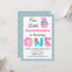 Bright and colourful light blue glitter sparkles first birthday invitation with a sweet and cute cupcake and doughnut and candy letters. Easily add your full name, and the date, time and address of the birthday party. Perfect for a sweet little princess turning one!
