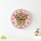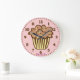 Cute personalized cupcake wall clock. The design is decorated with a fun large cupcake with chocolate frosting and colorful sprinkles. The bottom part, just under the number six, includes a custom name that is easy to personalize. Great kids room decor.