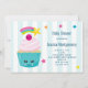 A baby shower invitation with a light blue and white striped background. Layered over top is a cute cupcake with a kawaii smiling face. A cherry on top also has a cute face. A shooting star is flying in the air. Some colourful stars decorate the design.