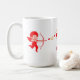 Vibrant cartoon cupid with wings, a red dress, and a bow flies across a heart-filled red backdrop. Perfect for Valentine, romance, and family-themed projects.