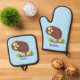 Cute curious funny brown owl cartoon illustration oven mitt & pot holder set