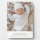 A sweet custom baby photo plaque with birth stats. Replace the sample image, upload your own newborn baby photo, and add your birth stats. Display this lovely plaque on a mantelpiece or in the nursery. Gold coloured typography. you can use the simple design tool to explore font colours.