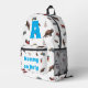 Design features a pattern of toy trains, sailboats, dinosaurs and dump trucks against a white background. Perfect for moms of little boys! Large initial is featured at top; your text is displayed on front pocket in a bright blue. All text is customisable.