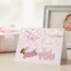Cute dachshund themed girl baby shower thank you card illustrated with an adorable dachshund wearing a pink sweater, floating amongst a bunch of soft pink and beige balloons. Playful clouds and stars add to the whimsical theme. This folded thank you card is sure to bring smiles whilst evoking a gentle, joyful vibe.