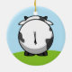 A cute cartoon cow on a round ornament. The flip side of the ornament shows the tail end of the cow.