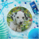 A cute seven weeks old black spotted  Dalmatian puppy, portrait in a flowery garden. A puppy-eyed baby doggy photo taken by Katho Menden, this disposable party paper plates are an enchanting gift idea for dog lovers.
