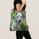 A cute seven weeks old black spotted Dalmatian puppy, standing in a wicker basket in a flowery garden. The puppy-eyed baby doggy photo taken by Katho Menden, this all-over printing shopping bag is an enchanting gift idea for dog lovers.