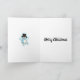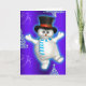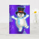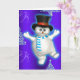 A whimsical little snowman Christmas card with an extremely cute snowman dressed in a shiny black top hat and wearing a blue and white striped scarf. He's dancing in the snow with Christmas trees around him, all on a colourful blue gradient background. This very festive card will be a big hit with whoever is lucky enough to receive it. The text inside (which simply reads, Merry Christmas, can be personalised to suit if needed).