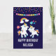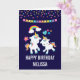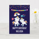 A birthday card with 2 cute dancing unicorns with bright and colourful tails, and mane. A colourful rainbow with clouds on each side above their heads. Other elements include a little flower a heart and some stars. Dark purple background. Colourful confetti dots and a bunting banner image along the top.
