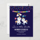 Save the date party postcard with 2 cute dancing unicorns with bright and colourful tails, and mane. A colourful rainbow with clouds on each side above their heads. Other elements include a little flower a heart and some stars. Dark purple background. Colourful confetti dots and a bunting banner image along the top.