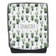 A personalised backpack with a rustic western flavour. Designed with a bunch of cute green cactuses in a repeating pattern. Specifically, green coloured prickly cactus, in all kinds of shapes and sizes, each sitting in its own dark blue flower pot. Little decorative triangles in between them. Whimsical fun illustration.