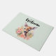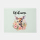 A welcome doormat with a beautiful illustration featuring a cute deer. Surrounded by pink roses and flowers.
