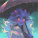 cute demon girl aesthetic, glowing eyes fantasy, cosmic umbrella artwork, blue skin anime character, magical girl in the rain, rainy day, enchanted night sky theme, whimsical horns fashion, fantasy street style, pastel goth character design