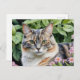 A postcard with a charming image of a dilute tortoiseshell cat. The cute tortie is pictured in a garden with pink flowers and green leaves.