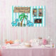 This boy's birthday banner features blue and teal stripes, a couple of dinosaurs, a palm tree and your son's photos.