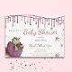 Cute purple baby shower invitation with an illustration of a dinosaur hatching from a purple egg. At the top of the invitation there are some strings of stars in brown, purple and yellow colours. Personalise all the information with your own.