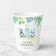 It's a Boy Dinosaur themed baby shower paper cups! Design features an adorable watercolor baby dinosaur just hatched from an egg, colourful typography, palm leaves and other botanical greenery.