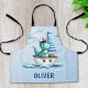 Personalised adorable Captain Dino Sailboat blue apron! Picture a charming dinosaur captain navigating the high seas aboard a charming sailboat. This captivating design blends cuteness with adventure.