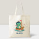 Personalised Little Dinosaur Sailboat Captain ftote bag. Picture a cute dinosaur captain navigating the sea aboard a charming sailboat. This captivating design blends cuteness with adventure, perfect for inspiring imaginative play and snuggles.