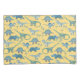 Lots of blue dinosaurs, Tyrannosaurus rex, Spinosaurus, Stegosaurus, Diplodocus and Triceratops on a yellow background.