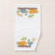Towel set with a cute design featuring 4 dinosaurs. 2 are flying and 2 are on the ground. Created with watercolors.