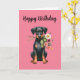 This adorable Doberman dog birthday card includes a cute Doberman dog holding flowers graphic as well as a custom saying on the inside. This design also includes a pink background. Enjoy this Doberman puppy birthday card!
