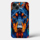 Striking and vividly colourful depiction of a dog's face, likely a Doberman. The dog’s fur is portrayed in deep blues and vibrant oranges, creating a bold and artistic contrast. The eyes are intensely luminous, drawing the viewer's attention, and the overall composition gives a sense of depth and texture.
