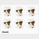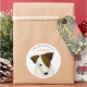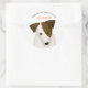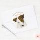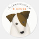 These cute children's book labels for girls or boys feature a digitally illustrated Jack Russell dog with brown ears and a brown eye patch, her head whimsically tilted to the side - text reads "This book belongs to" - customise the child's name - Jack Russell Terrier with Head Tilt design © katz_d_zynes 2019