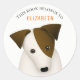 These cute children's book labels for girls or boys feature a digitally illustrated Jack Russell dog with brown ears and a brown eye patch, her head whimsically tilted to the side - text reads "This book belongs to" - customise the child's name - Jack Russell Terrier with Head Tilt design © katz_d_zynes 2019