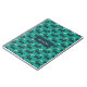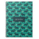 A spiral notebook designed with a repeating pattern featuring a cute smiling doggy with floppy ears and a dog bone. Green background.