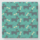 A stone coaster designed with a repeating pattern featuring a cute smiling doggy with floppy ears and a dog bone. Green background.
