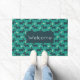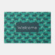 A welcome doormat designed with a repeating pattern featuring a cute smiling doggy with floppy ears and a dog bone. Green background.
