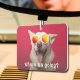 "Where we going?" text over a cute dog photo (can be changed to your dog) on a fun air freshener. An affordable gift for family, friends or create for yourself, they are double-sided and available in different shapes and several amazing long lasting, odour eliminating scents.