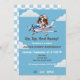 Design features a cute dog wearing a pilot's helmet and goggles flying through blue sky surrounded by white puffy fun clouds with his Cessna aeroplane. On the back is a blue and white chequered background, a design typically found in aircraft. This card sets the tone for a party everyone will love.