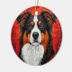 Dog's face set against a bold red circular background. The dog features distinct markings with black, brown, and white fur, and striking orange eyes, giving it an expressive and captivating look.