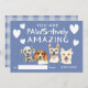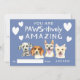Cute valentine's day card for your kids to give out at school. There are watercolor illustration of 4 different dogs (dalmatian, beagle, American pit bull terrier). The text above says "You Are PAWS-itively AMAZING" with hearts floating around the text. You can add your child's name at the bottom of the card.